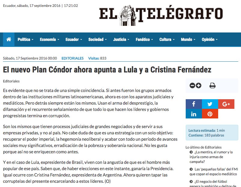 La expresidenta compartió en su cuenta de Twitter, un artículo del diario El Telégrafo de Ecuador, donde denuncia la implementación del un plan que apunta a destruir los avances sociales que se legraron en los gobiernos de centroizquierda que hubo en Latinoamérica. El artículo se titula: "El nuevo Plan Cóndor ahora apunta a Lula y a Cristina Fernández". La expresidenta Cristina Fenrández compartió en las redes sociales un editorial del diario El Telégrafo de Ecuador, donde se denuncia la implentación de un "Nuevo Plan Cóndor" en la región que apunta contra Lula Da Silva y a ella.